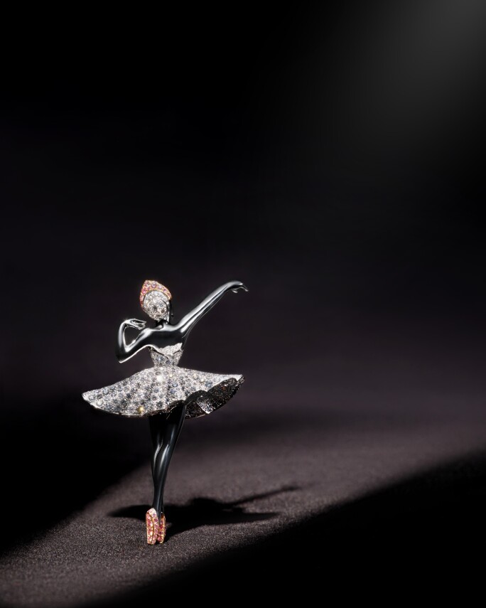 然而,芭蕾舞伶胸针的真正美态在于设计细节。每枚胸针都采用世家的专有技术和工艺制作,芭蕾舞伶拥有以玫瑰式切割钻石为脸庞的标志设计,舞裙轻盈灵动,许多舞裙都以褶饰黄金打造, 镶嵌珍贵宝石和装饰石。其中较为瞩目的胸针是出自Bals de Légende高级珠宝系列的设计,系列从世上最华丽的传奇舞会汲取灵感,展示不断挑战想像界限的梦幻逸品,令人无比倾心。