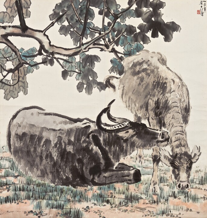 Xu’s paintings included portraits, historical events, animals and landscapes. From a young age, he would portray what he observed in nature. In his many animal paintings, such as those of horses, cows, chickens, eagles, and lions, would typically have deeper underlying meanings. In 1935, Zhang Daqian, who taught at the National Central University, and Xu Beihong brought their students to Huangshan to sketch, creating indelible images of the Li River and the Himalayas. These scenic vistas were frequent subjects of Xu’s work.