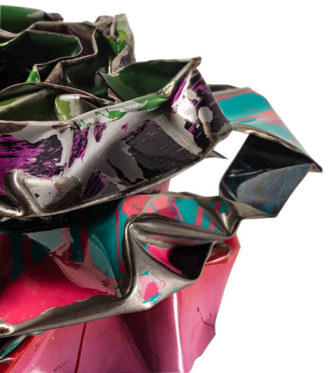 Exécuté en 1990, Pettitoes Pogamogan incarne une esthétique à mi-chemin entre le Pop Art et l’expressionnisme abstrait, propre à l’artiste américain John Chamberlain. Formée de pièces de carrosseries lustrées, compressées et enroulées, Pettitoes Pogamogan est le fruit d’une improvisation maîtrisée et intuitive, qui révèle la poésie et la grâce d’objets purement industriels.
