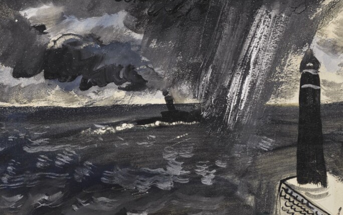 In 1937, Piper wrote an article in which he identified the two most important, underlying subjects in his work. The first was a room, framed from a window, and the second was the structure on a beach, or as he called it the ‘beach-machine.’ This offered Piper both the possibility of man-made structures, such as the lighthouse, and also a vast range of inspiration from the changing natural climate of the beach and sea. In this example, he has added the drama of a sudden squall with a burst of isolated rain and a labouring vessel bellowing smoke. His subjects of marine views might be traditional, but they were never boring. The work is reminiscent of the Folk art found in Alfred Wallis’s maritime paintings but are more painterly and composed.